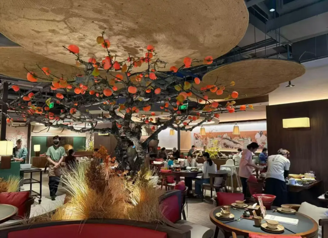 设计上完成关键转身:主色调从红色变为绿色系,塑造“清新、自然”的直观印象。空间巧妙提炼山西“柿子”等地域符号作为打卡点,并融合现代壁画与国风服饰(如马面裙),营造轻盈、有记忆点的文化氛围,避免了传统表述的厚重感。