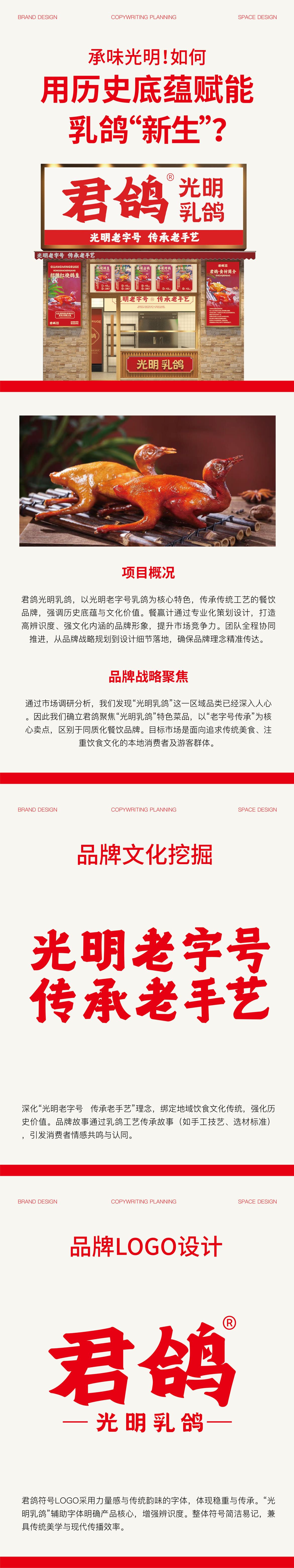 【项目概况】 君鸽光明乳鸽,以光明老字号乳鸽为核心特色,传承传统工艺的餐饮品牌,强调历史底蕴与文化价值。餐赢计通过专业化策划设计,打造高辨识度、强文化内涵的品牌形象,提升市场竞争力。团队全程协同推进,从品牌战略规划到设计细节落地,确保品牌理念精准传达。 【品牌战略聚焦】 通过市场调研分析,我们发现“光明乳鸽”这一区域品类已经深入人心。因此我们确立君鸽聚焦“光明乳鸽”特色菜品,以“老字号传承”为核心卖点,区别于同质化餐饮品牌。目标市场是面向追求传统美食、注重饮食文化的本地消费者及游客群体。 【品牌文化挖掘】 深化“光明老字号 传承老手艺”理念,绑定地域饮食文化传统,强化历史价值。品牌故事通过乳鸽工艺传承故事(如手工技艺、选材标准),引发消费者情感共鸣与认同。 【品牌LOGO设计】 君鸽符号LOGO采用力量感与传统韵味的字体,体现稳重与传承。“光明乳鸽”辅助字体明确产品核心,增强辨识度。整体符号简洁易记,兼具传统美学与现代传播效率。 【品牌vi物料设计】 招牌设计主视觉:醒目红色大字“君鸽光明乳鸽”+辅助标语“光明老字号 传承老手艺”,快速传递核心信息,吸引路人注意力。店内海报以乳鸽菜品高清图+价格信息,刺激食欲并引导消费,风格简洁明快,突出食物质感与文化符号。 品牌VI色彩系统,主色调红色,象征热情、活力与传统美食的浓郁底蕴,具备强视觉冲击力。辅助色米白,营造温馨、传统的用餐氛围,契合老字号定位。 【品牌空间设计】 品牌空间功能区划分为点餐区、菜品展示区,优化消费流程,简洁大方,突出实用性。文化装饰元素悬挂乳鸽主题传承标语墙,强化品牌文化氛围,让顾客沉浸于历史传承体验中。 【总结】 通过系统化策划设计,君鸽品牌以“光明乳鸽”为核心,融合老字号文化基因,构建了从视觉识别到空间体验的全维度品牌体系。红色主调与传统字体强化辨识度,文化符号与故事性内容深化情感链接,最终实现品牌差异化竞争与市场影响力的全面提升。